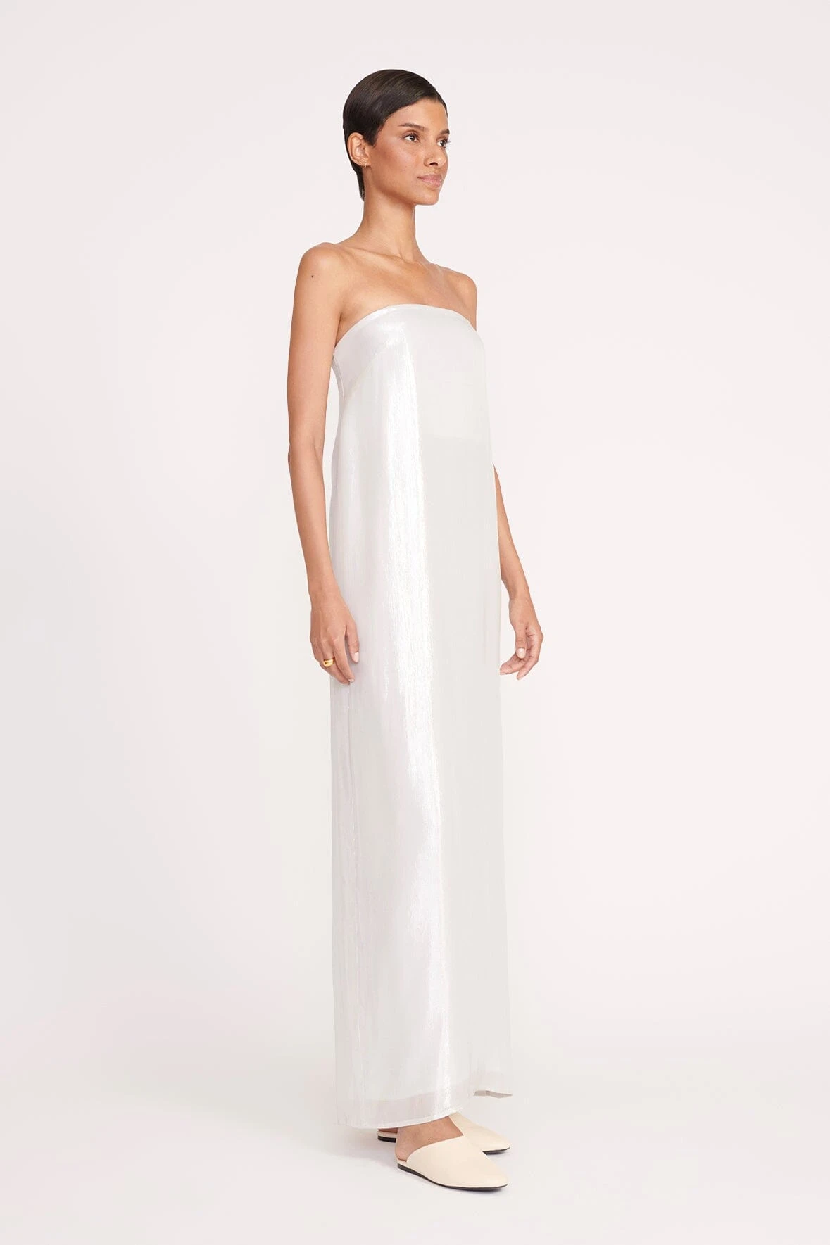 Our best-selling Casey Dress has been reimagined for the season; crafted in satin with a lamé finish, this strapless gown features a relaxed silhouette throughout the body, a back slit, and a hidden zipper.