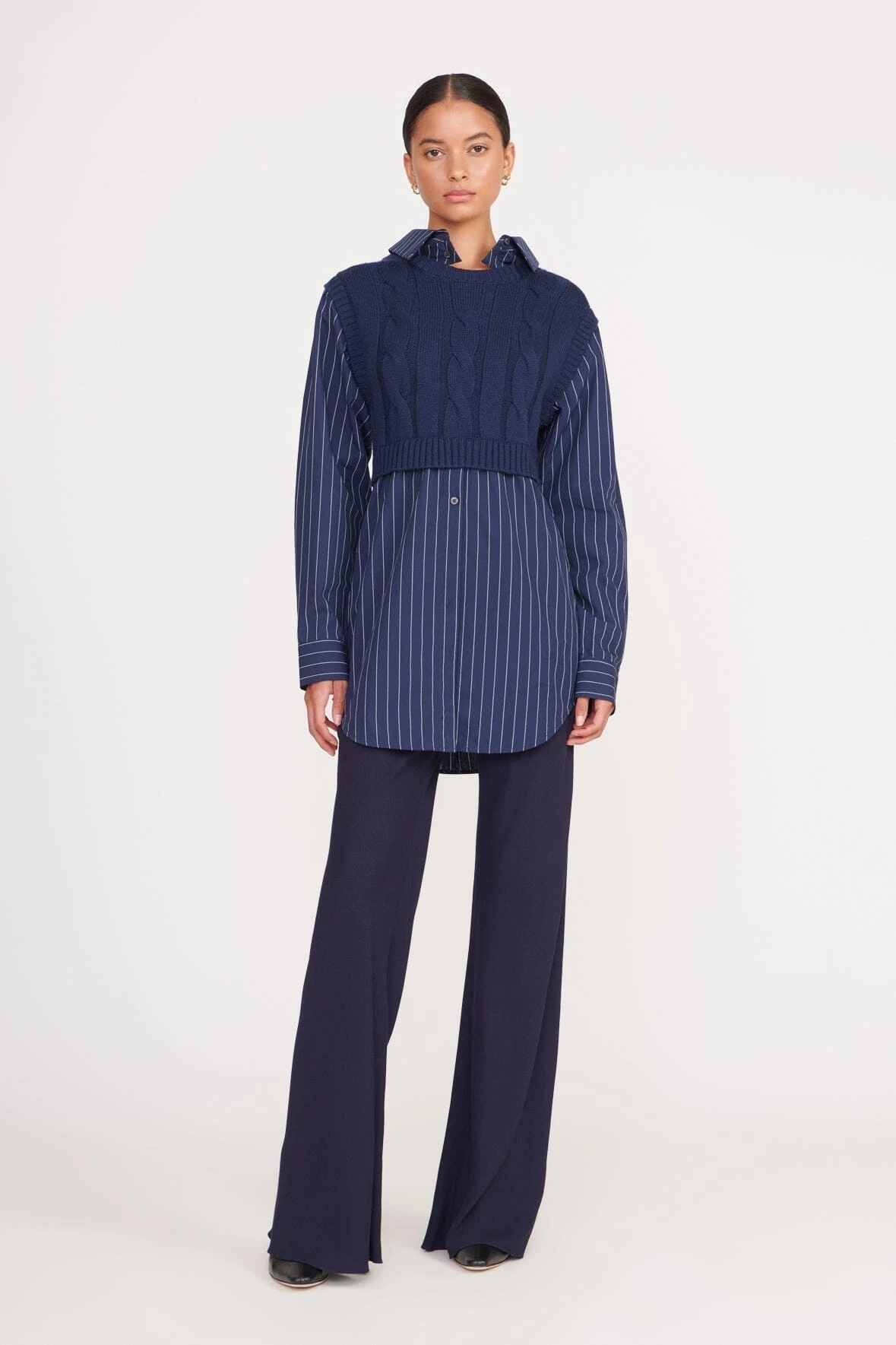 A layered poplin and knit long-sleeve top, the Cooper Top features a cable knit vest over a poplin button-up shirt for a layered look with one-piece ease.