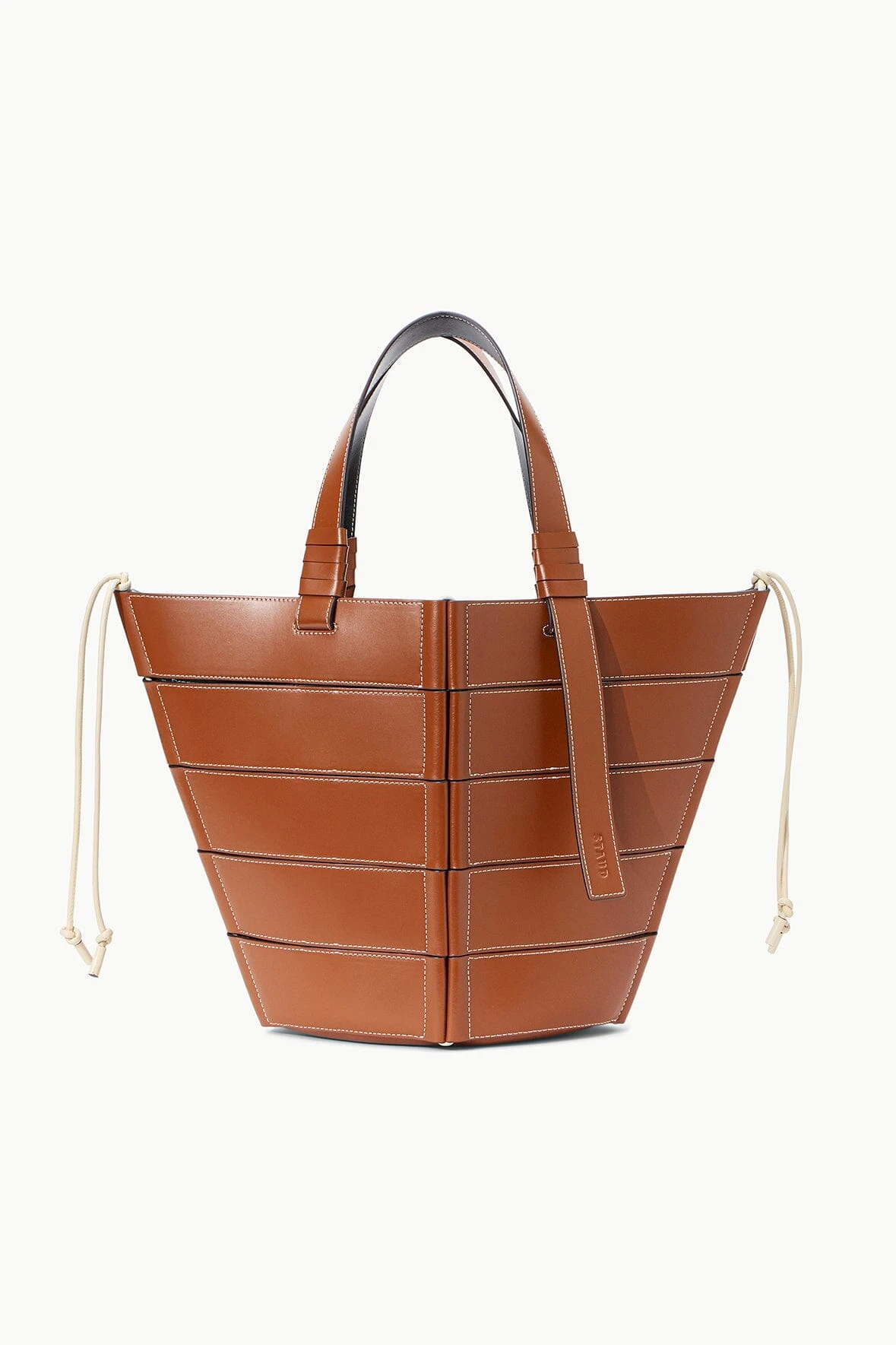 The Diamond Tote features a slatted leather construction with natural cotton decorative cords and a removable canvas drawstring pouch with interior pocket.