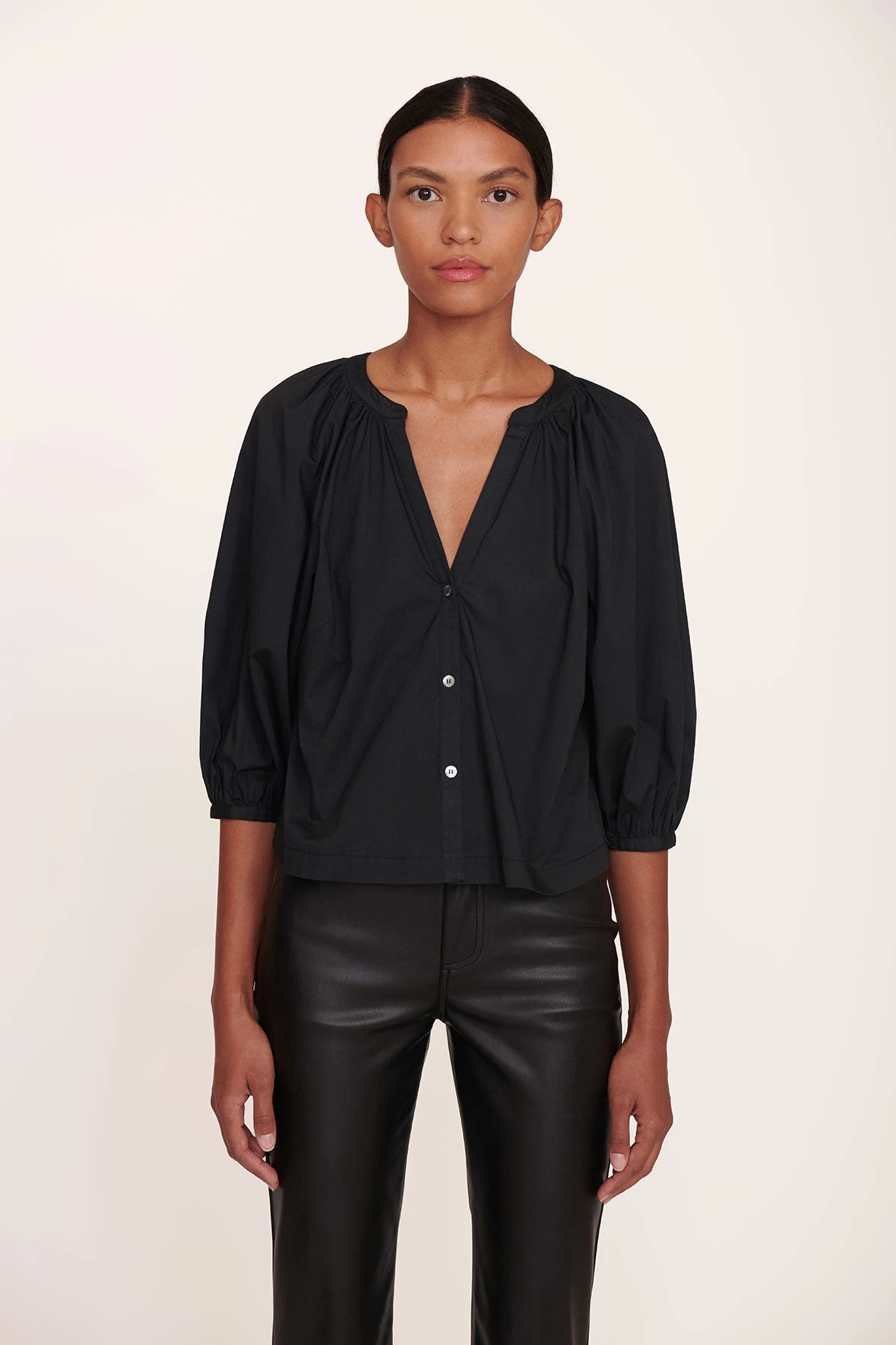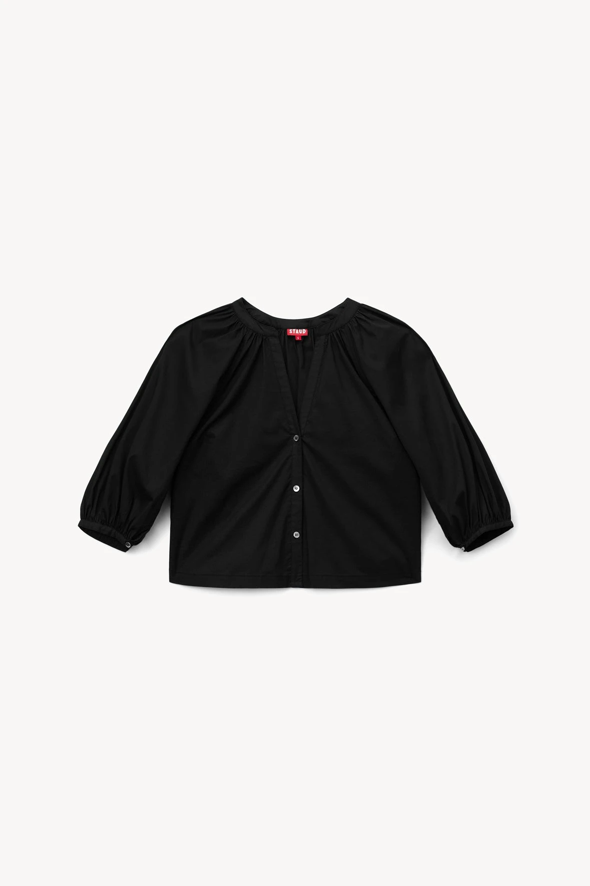 The Dill Top is a cotton poplin button-down with 3/4 puffed sleeves. This classic top can be worn year-round.