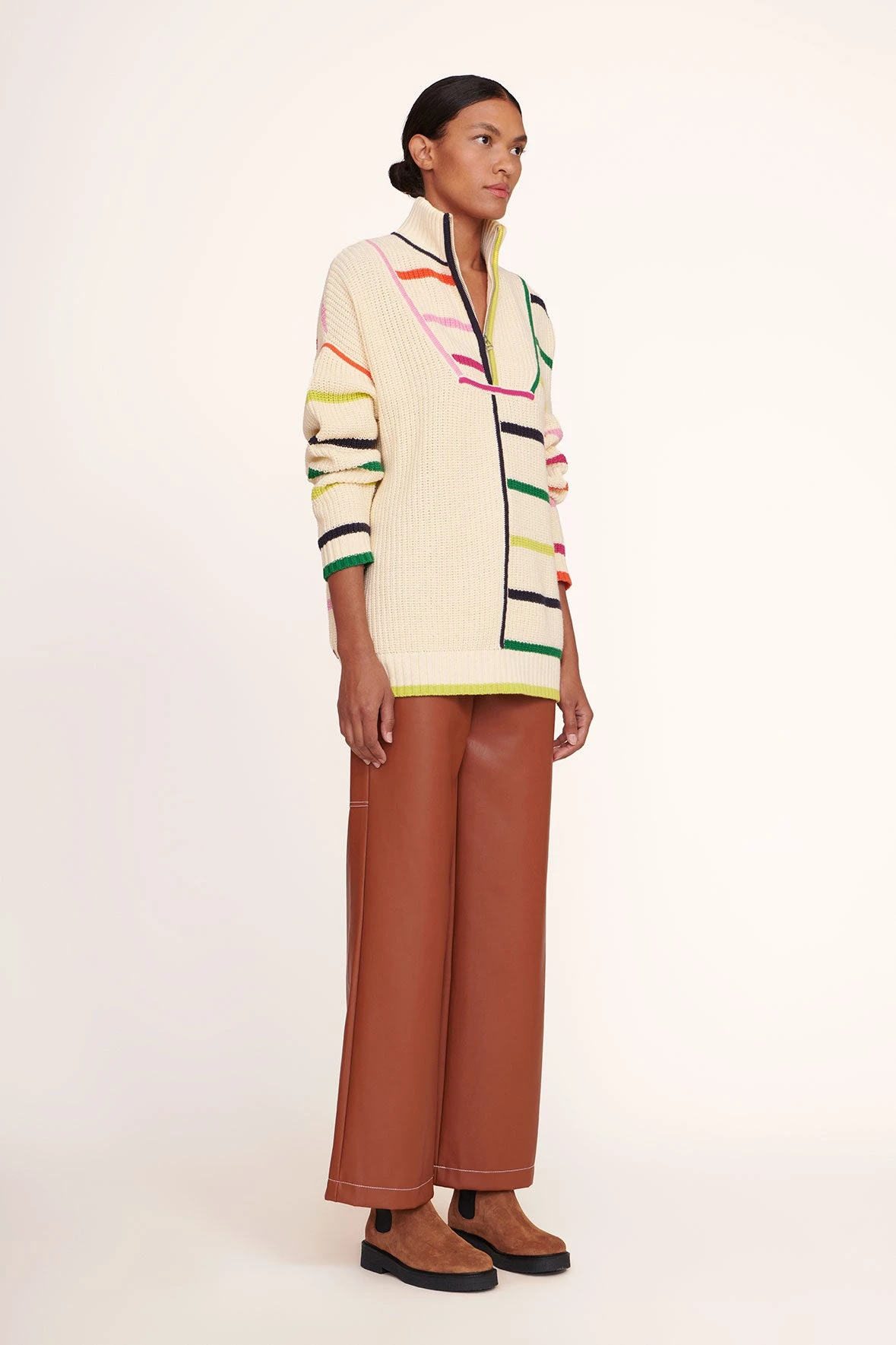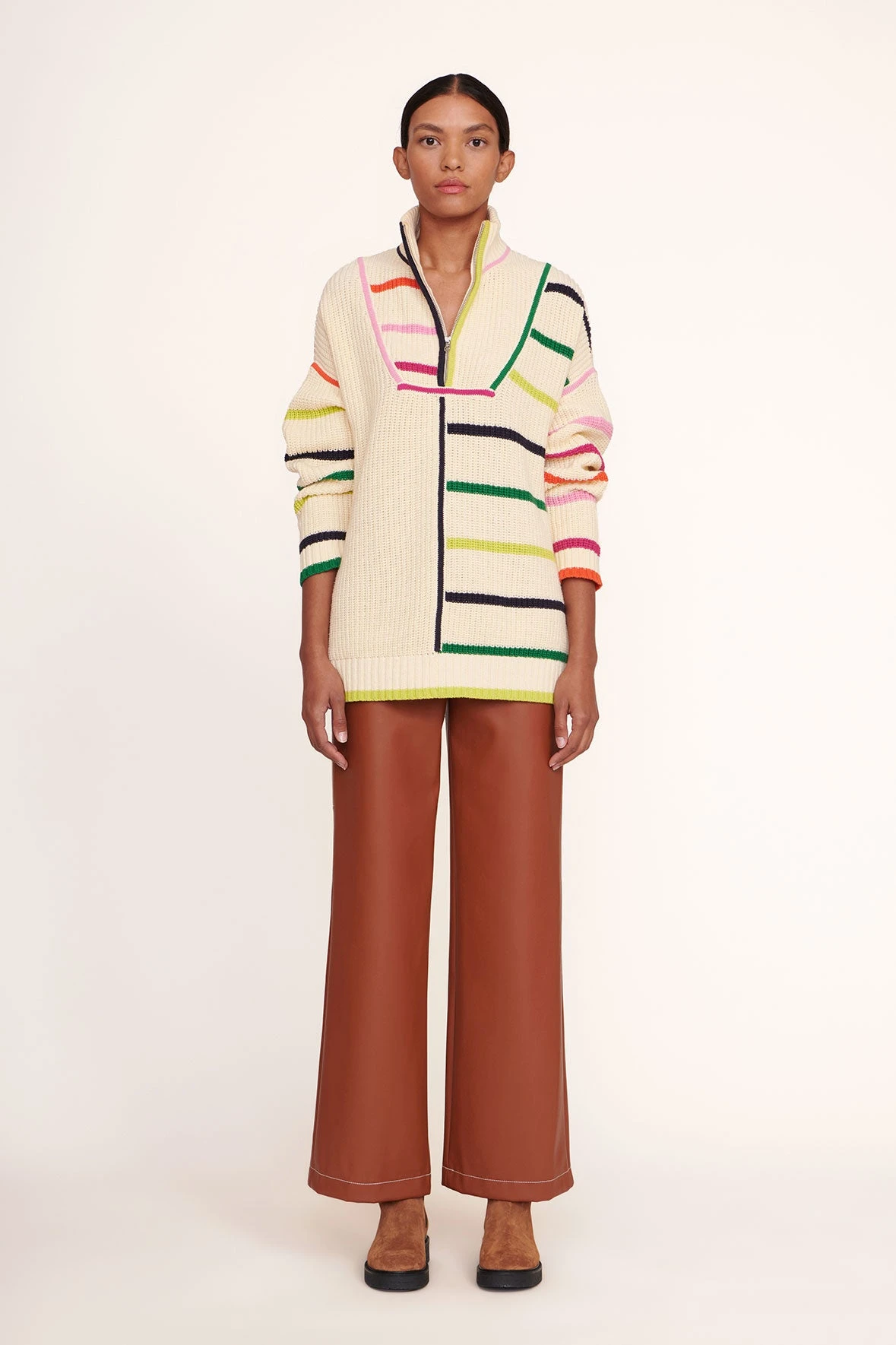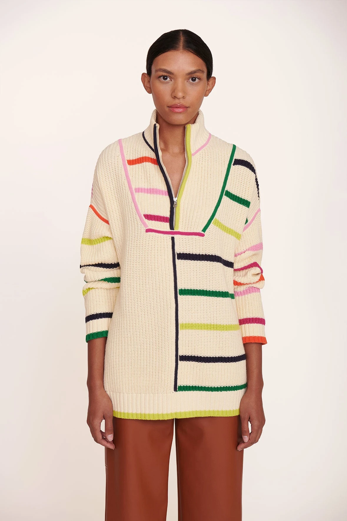 Our chunky cotton knit Hampton Sweater is an oversized boyfriend-style sweater in a bright, colorful stripe pattern. This style features a half-zip detail at the front.
