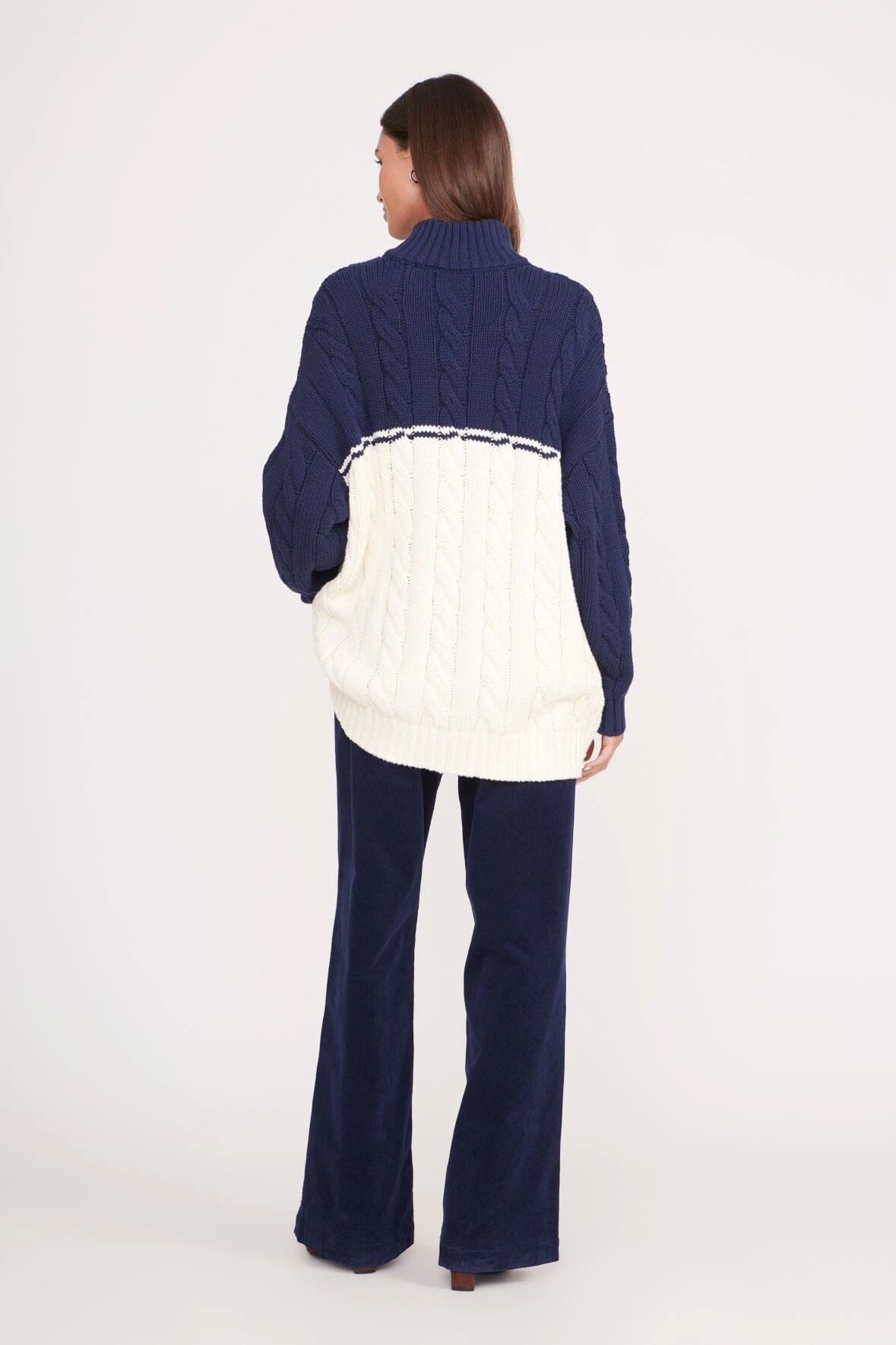Our signature oversized boyfriend sweater gets a seasonal update with contrast whipstitch detailing. This style features a half zip and mixed knit patterns.