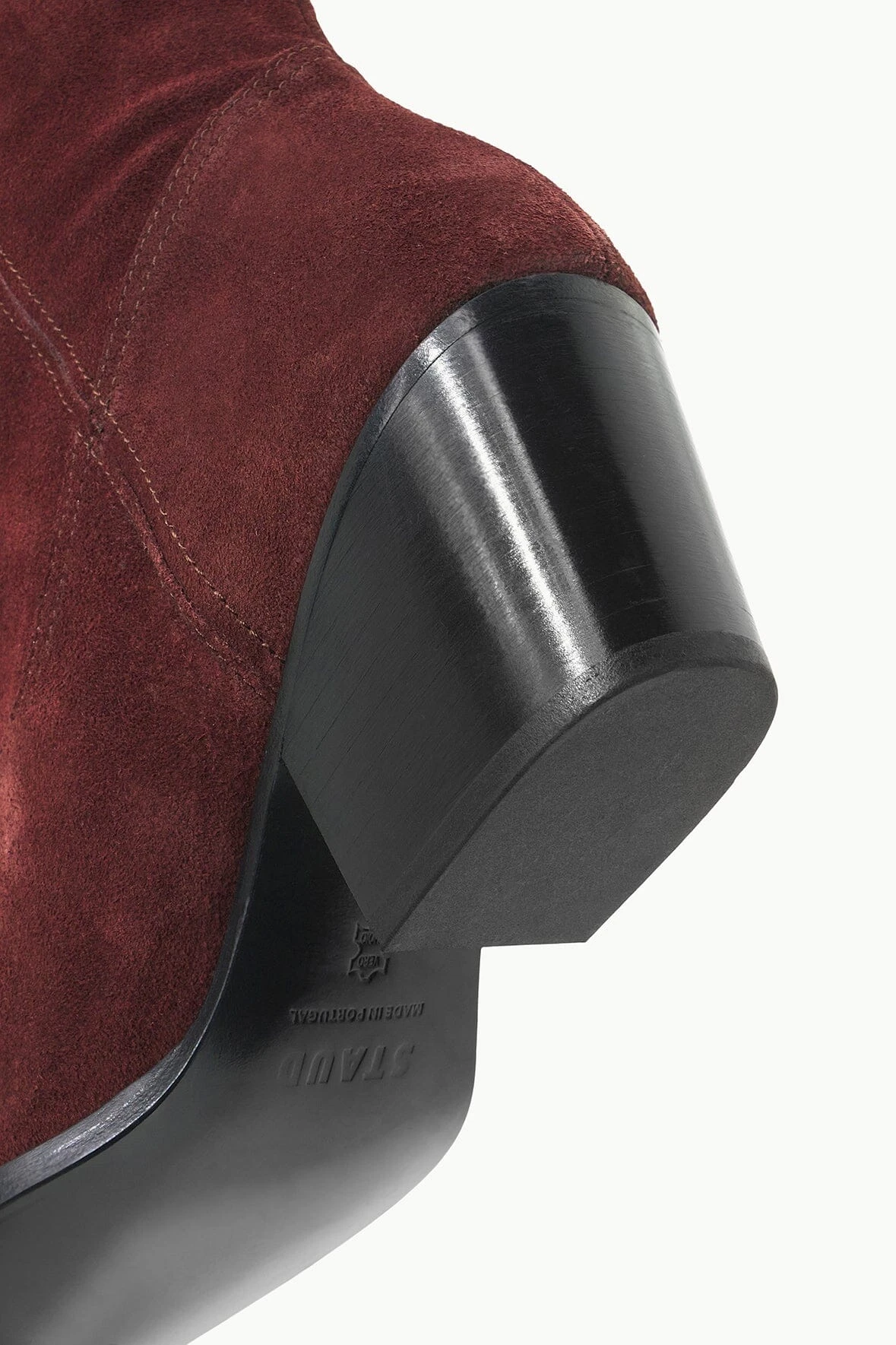 New for the season, the June is a true pointed toe cowboy boot made from soft suede with contrast stitching. This style features western seaming and cuban heel.