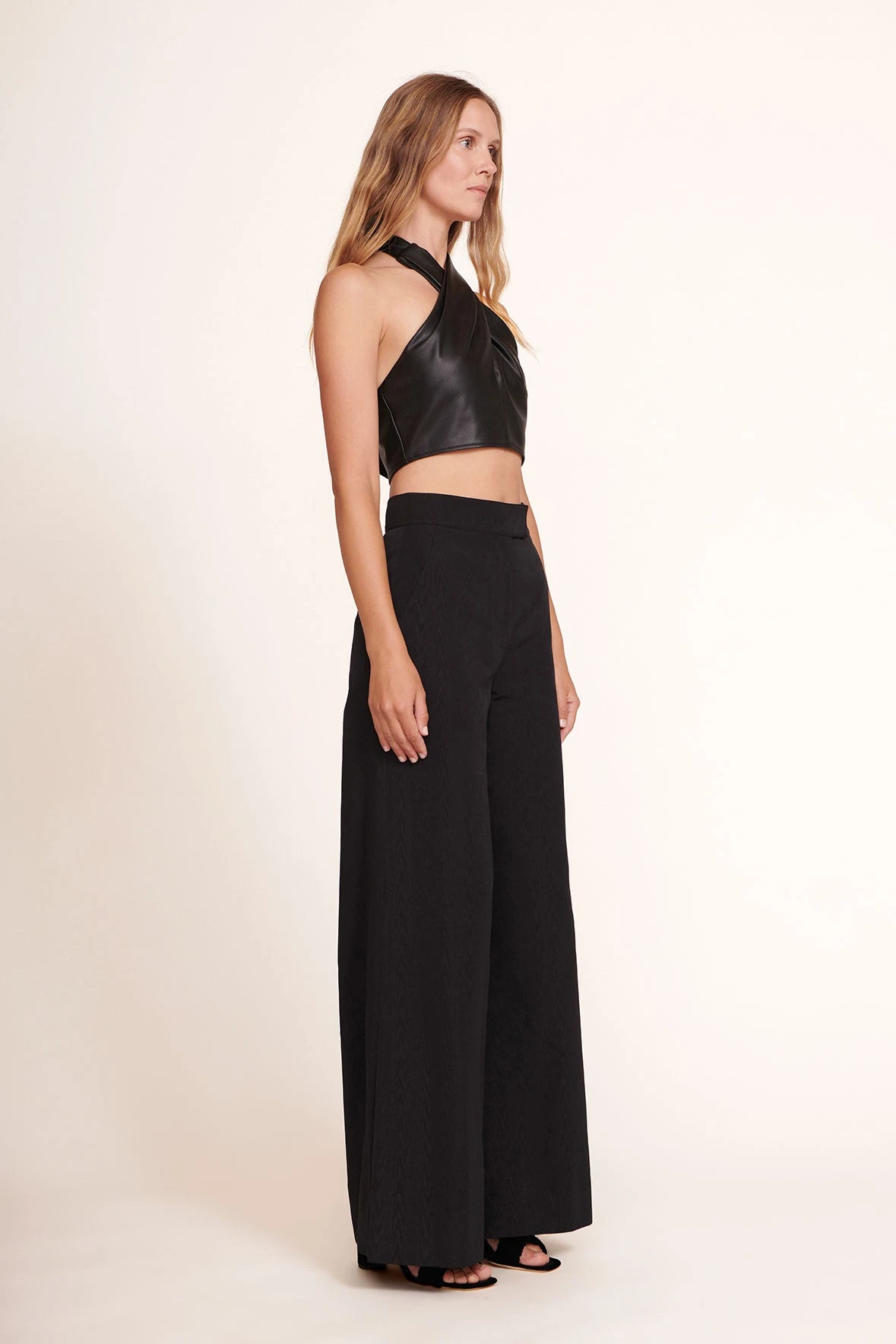 The Kai Top is a cropped, fitted halter top constructed out of a slightly stretchy vegan leather fabric. This style features a self-tie neck and hidden zipper closure at the side.