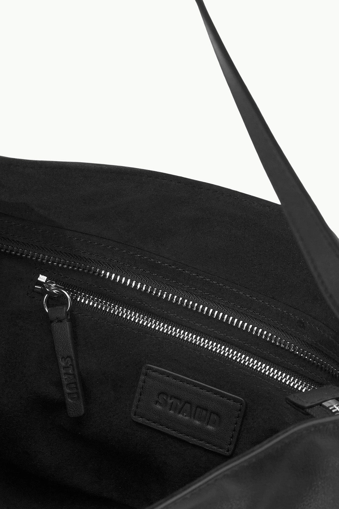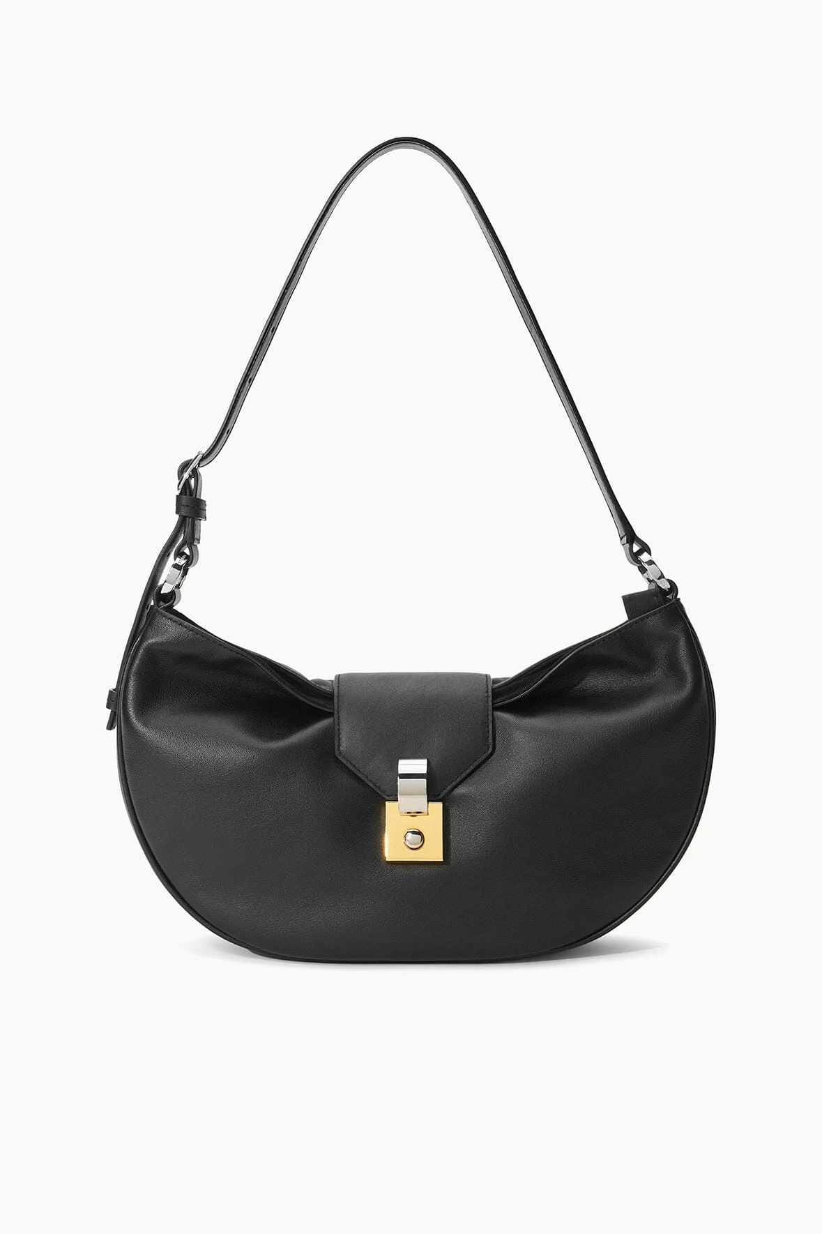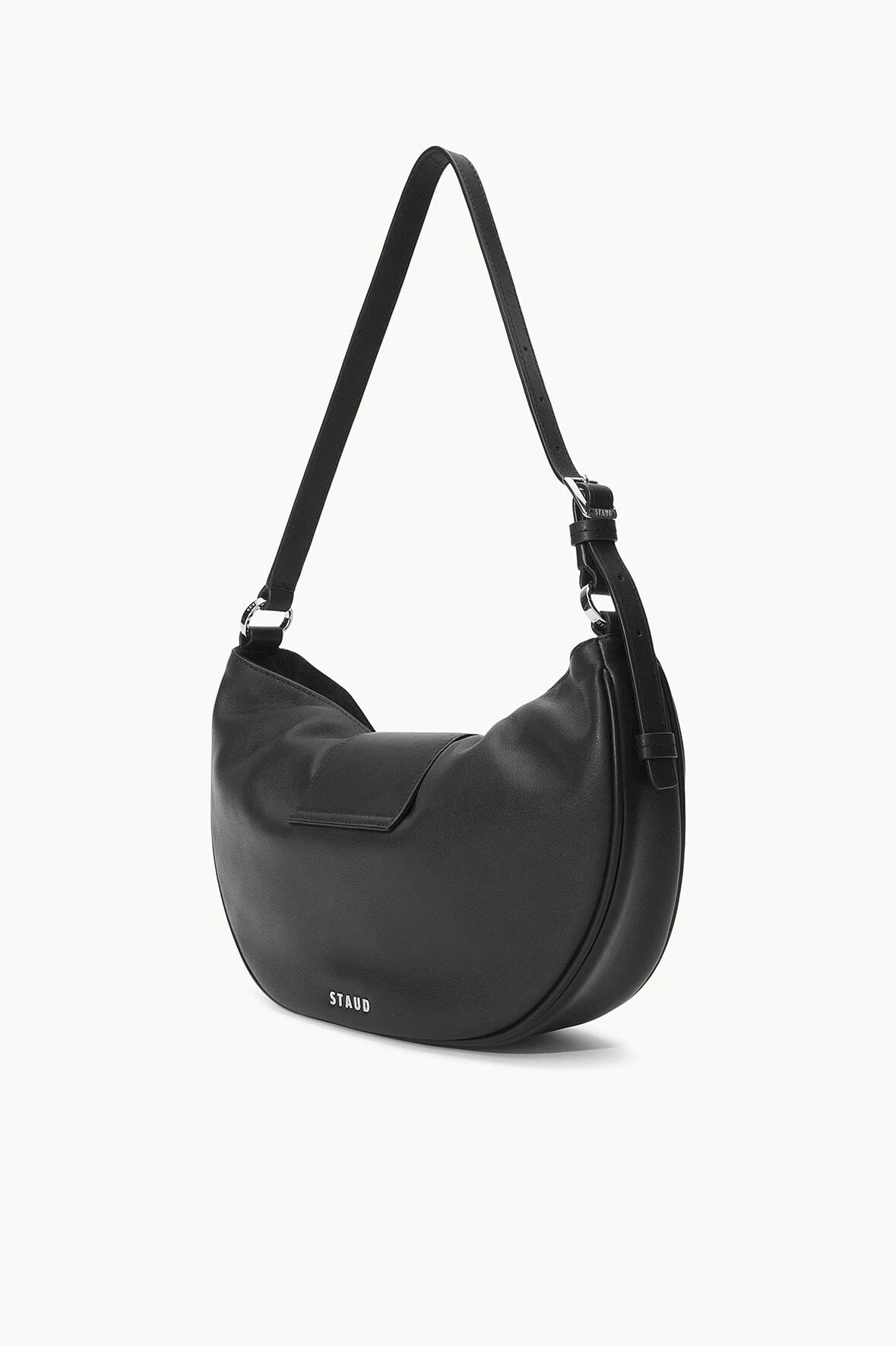 A soft, crescent-shaped shoulder bag with pushlock closure detail. The Marike Bag features an adjustable shoulder strap offering versatility in wearing long or short.