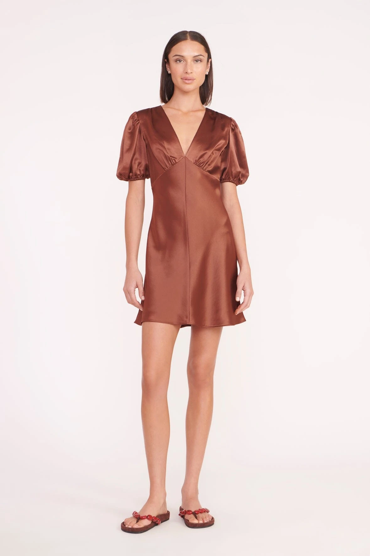 A short sleeve mini crafted from a drapey satin fabric, the Mini MIlla features a v neck and empire waistline. This seasonal update in satin has a hidden zipper closure at the side.