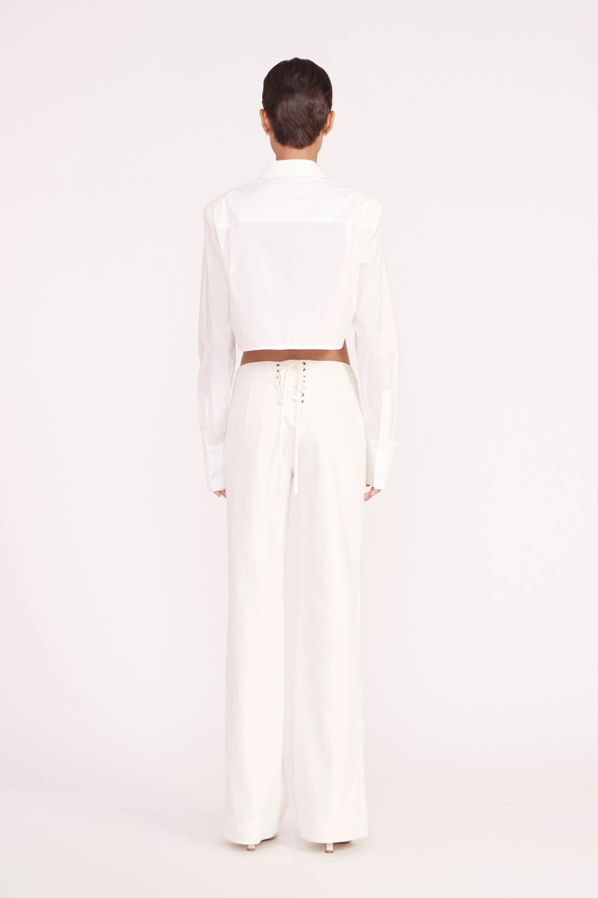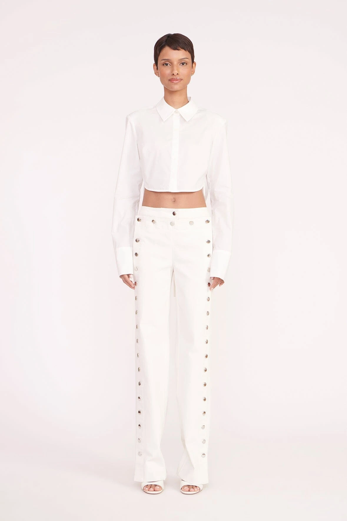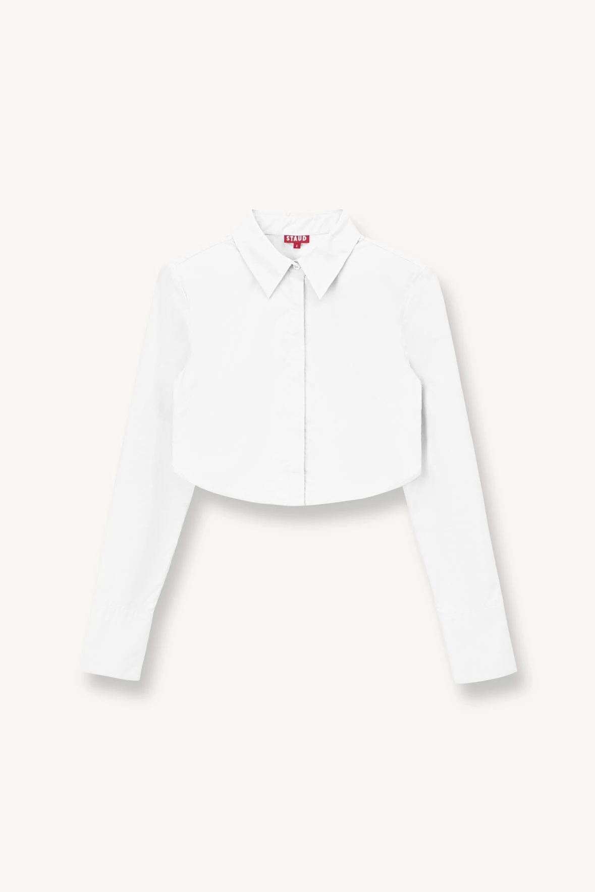 A cropped button down shirt, the Seneca Top is made out of a crisp cotton poplin fabric. This style features tall cuffs, a rounded hem and shoulder pads.