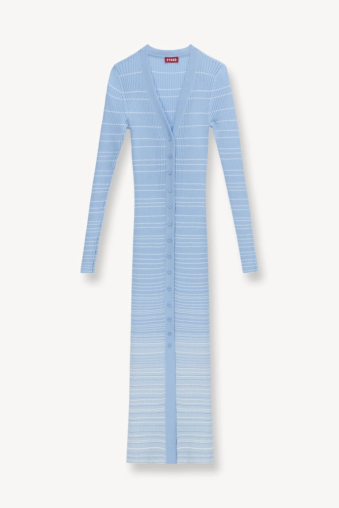 Our signature style in a new ombre stripe update. The Shoko Sweater can be worn as a cardigan or dress. This style is made out of a stretchy, comfortable compact rib knit fabric
