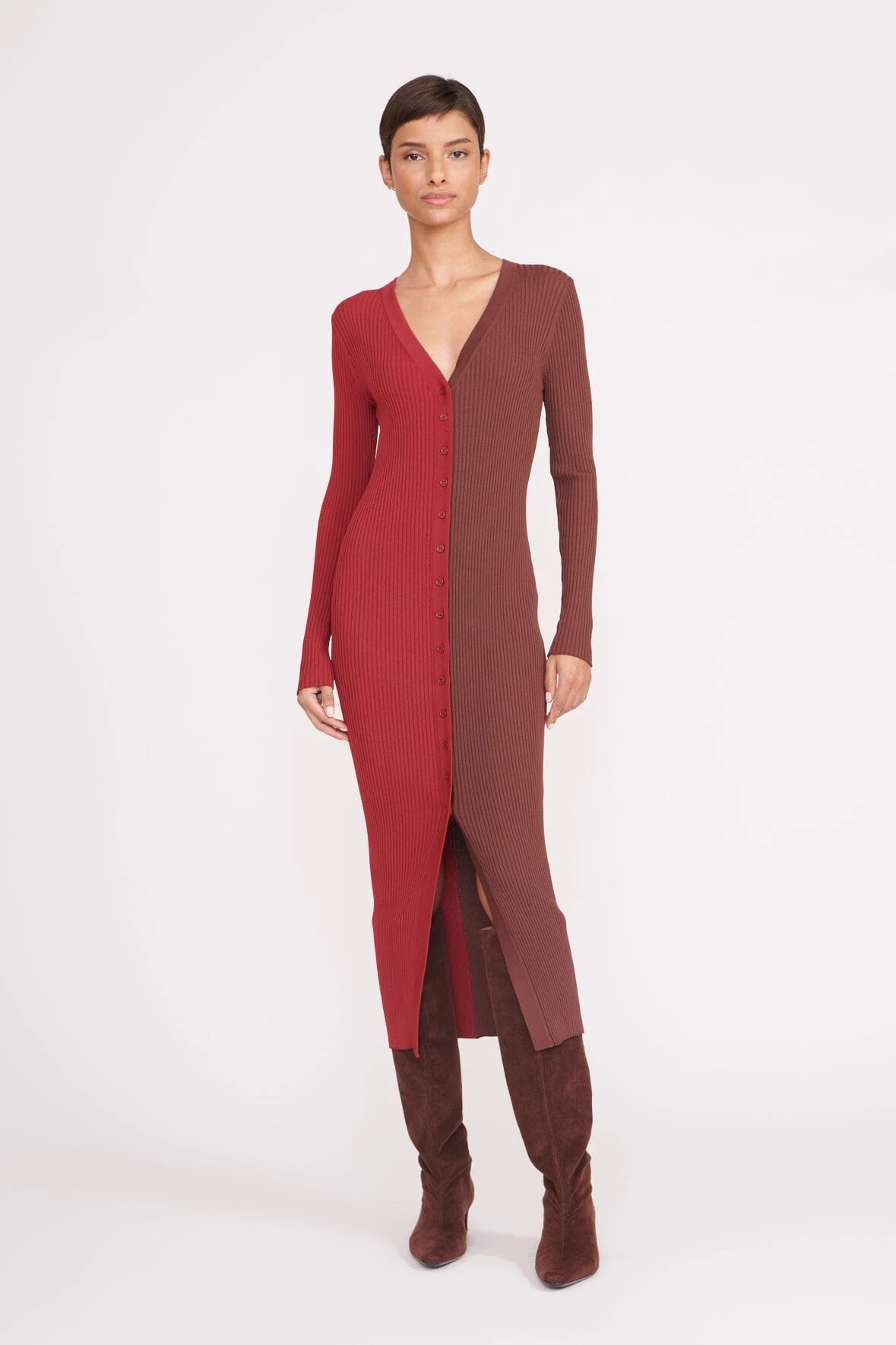Our signature style, the Shoko Sweater, can be worn as a cardigan or dress. This multi-color style is made out of a stretchy, comfortable compact rib knit fabric