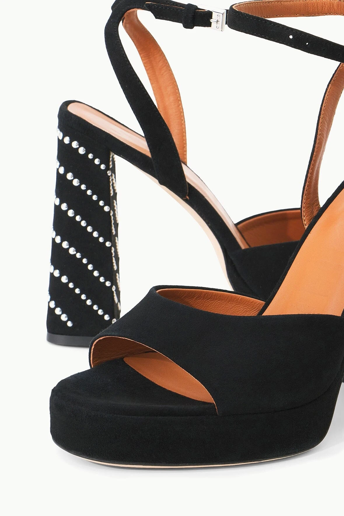 Updated for the season with a platform, the Solange is an open toe heel with ankle strap and buckle closure made out of suede with a metal stud embellished heel.